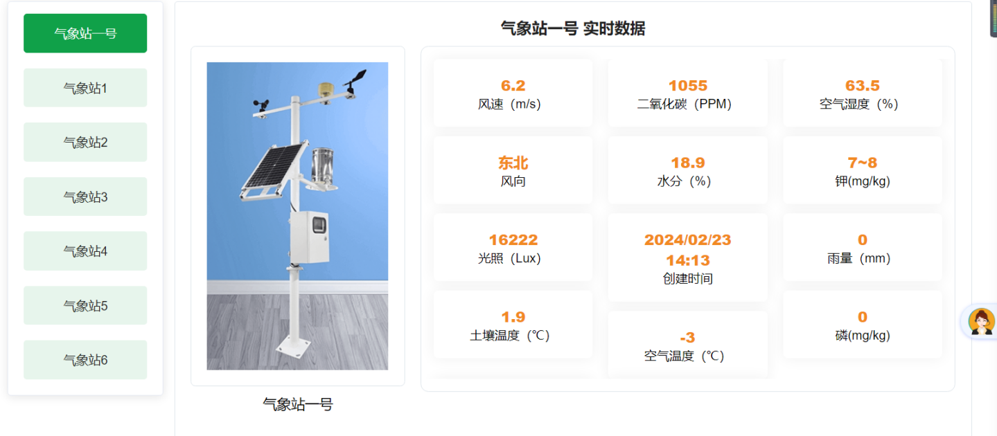 种植型客户:种植田地的温度、湿度、大气压、光照、风速、风向、雨量,氮、磷、钾、PH、EC土壤墒情以及田地的远程视频等数据信息。可以更精准的预防自然灾害并实时掌握种植基地土壤的湿度、肥力以及病虫害等情况,提高种植户的专业技术水平,提高农作物单产产量以及品质;